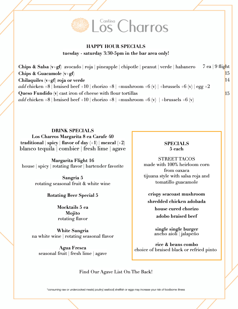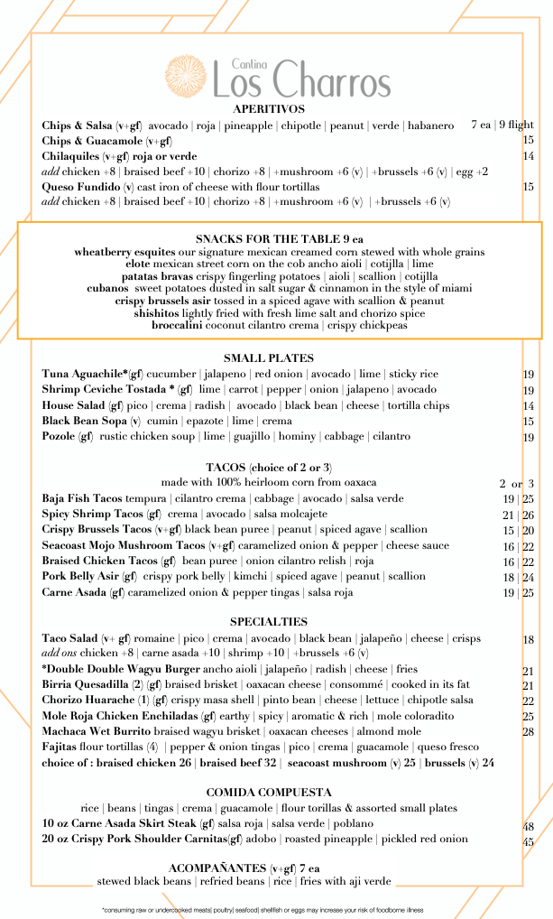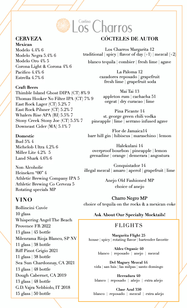 Chef Colt Taylor of The Essex RESTAURANT is excited to bring Branford Los Charros Cantina, an homage to authentic Mexican street food, in a sleek modern environment where every minute you're here feels like vacation. Enjoy the view of the kitchen with our 44 foot bar bustling with energy, reserve a couch for big parties, or enjoy an elevated dining experience in our dining room drawing inspiration from Tulum. Our restaurant is 21+ beyond 9 pm and all patrons will be carded at the door for the bar area.